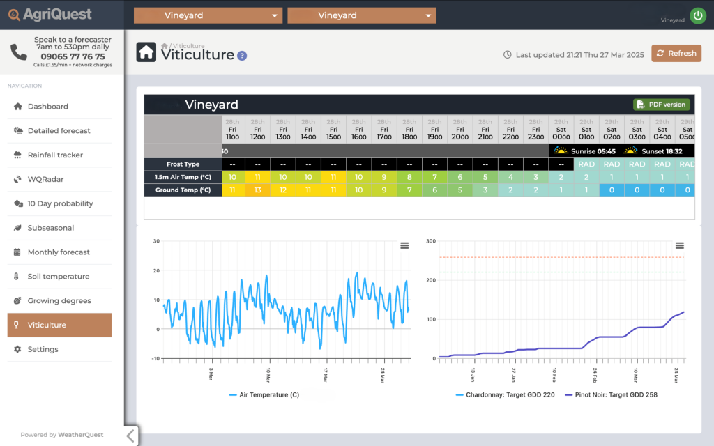 The VineBuddy service consists of an easy-to-use WebApp dashboard, showing the past 30 days of local temperatures, a GDD budburst threshold monitor and 48-hour ahead frost forecasts, with an option to integrate your own within-vineyard weather sensors. The WebApp is complemented by WhatsApp Frost Alerts and the option to call the WeatherQuest Forecast team, when you need to, for peace of mind.