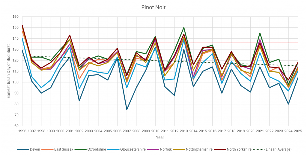 As an example, May 15th 2020 (Day 135, the horizontal red line on the graph) saw a very late spring frost event across major vineyard areas. Budburst in Pinot noir that year was estimated to be around Day 105 in East Sussex and Day 115 in Norfolk. But it’s easy to see how much more damaging it could have been if it had happened say in 2016 or 2021, when budburst in these same counties was around Day 130.